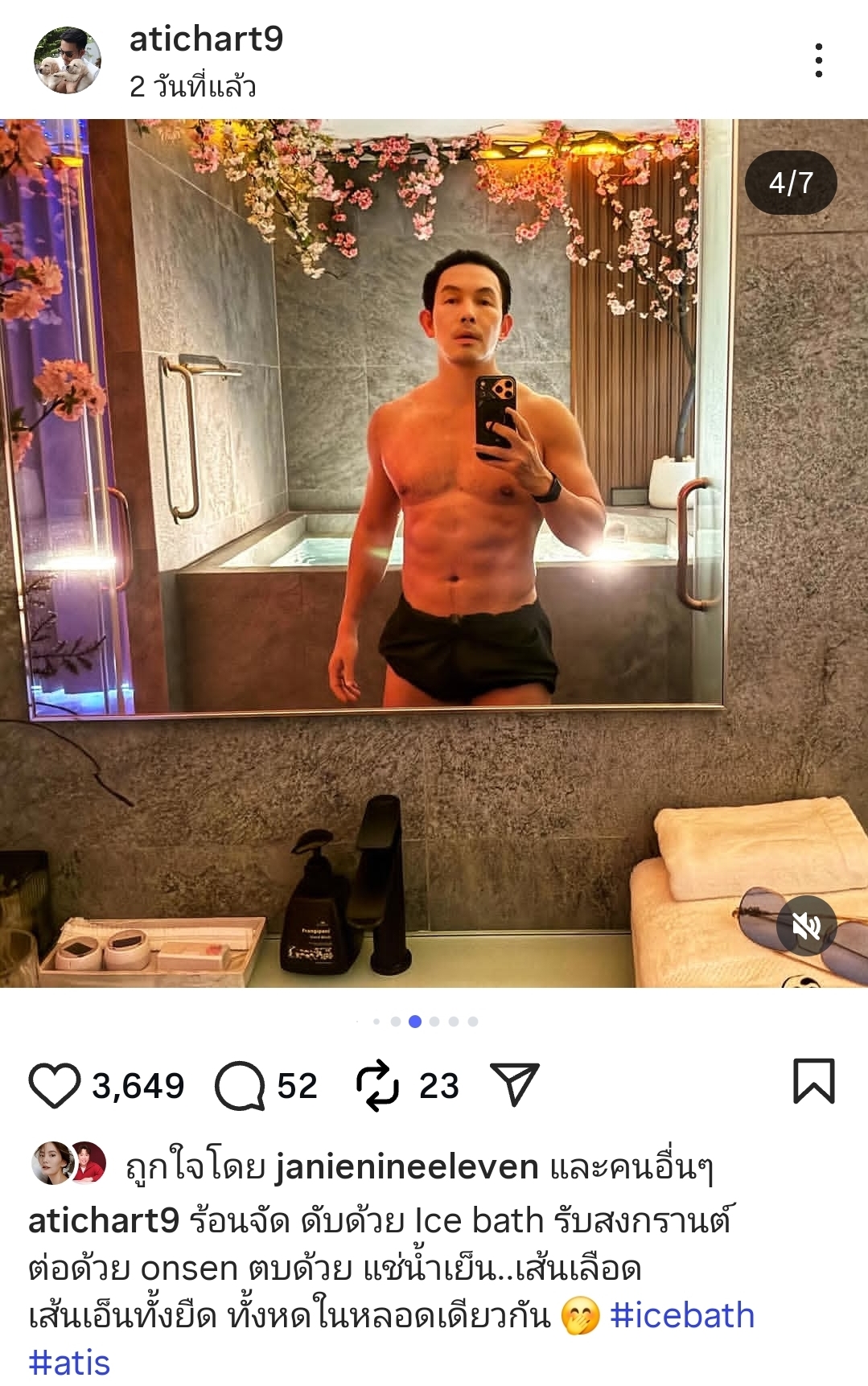 เรียกได้ว่าทำเอาสาวน้อยสาวใหญ่ รวมถึงเก้งกวางบ่างชะนีแทบหยุดหายใจ! เมื่อพระเอกตัวพ่อเจ้าของฉายาปากแดง “อั้ม อธิชาติ” ออกมาฟาดรูปเซตใหม่ลงอินสตาแกรมส่วนตัวแบบดุดันไม่เกรงใจใคร จัดเต็มความล่ำในโหมดถอดเสื้อแช่น้ำแข็ง (Ice Bath) รับซัมเมอร์ สงกรานต์นี้บอกเลยว่าน้ำที่ว่าเย็นยังสู้ความฮอตของพ่อไม่ได้!