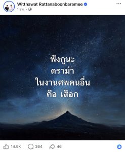 โดยเอม ได้ออกมาโพสต์ข้อความโดยระบุว่า “ฟังกูนะดราม่า ในงานศพคนอื่น คือ เสือก พร้อมทำพิมพ์คอมเมนต์เพิ่มเติมว่า เอาไว้เค้าไปขโมยกางเกงพ่อมึงมาใส่ก่อน ค่อยเสือกเรื่องของเค้า 🙏🏻