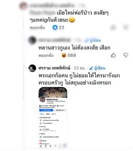 นอกจากนี้ ยังมีชาวเน็ตบางรายเข้ามาคอมเมนต์พยากรณ์ในแง่ลบว่า “ภาพความสุขแบบนี้จะอยู่ได้ไม่นาน อีก 2 ปีก็คงไม่เห็น” ซึ่งทางด้านหนุ่ม ศรราม ก็ไม่ปล่อยผ่าน สวนกลับทันควันถึง ท่ามกลางดราม่าที่เกิดขึ้น ก็มีแฟนคลับจำนวนมากเข้ามาให้กำลังใจ พร้อมสนับสนุนการตัดสินใจของหนุ่ม ศรราม ที่ออกมาปกป้องครอบครัวในครั้งนี้ โดยมองว่าบางครั้งการเป็นคนสาธารณะก็ไม่จำเป็นต้องอดทนต่อการคุกคามหรือคอมเมนต์ที่ไม่มีมารยาทเสมอไป