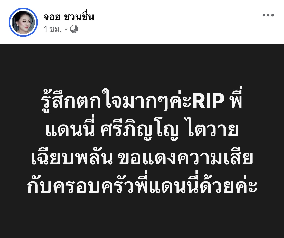 ล่าสุด “จอย ชวนชื่น” ได้ออกมาโพสต์แสดงความเสียใจทันที หลังทราบข่าว โดยเผยข้อความว่า รู้สึกตกใจอย่างมากกับการสูญเสียในครั้งนี้ พร้อมร่วมไว้อาลัยและส่งกำลังใจถึงครอบครัวของผู้จากไป