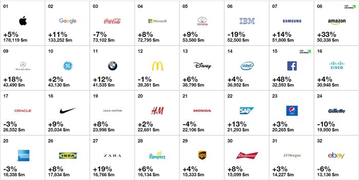 เป็นประจำทุกปีสำหรับการจัดอันดับ แบรนด์ที่มีมูลค่าสูงสุดในโลก ล่าสุดเว็บไซต์ Interbrand เผย 100 อันดับ แบรนด์ที่มีมูลค่าสูงสุดในโลก ประจำปี 2016 ในปีนี้ Apple คว้าอันดับ 1 ไป ด้วยมูลค่า 178,119 ล้านเหรียญสหรัฐฯ เติบโตขึ้นจากปีที่ผ่านมา 5% ตามมาด้วย Google, Coca-Cola, Microsoft, Toyota, IBM, Samsung, Amazon, Merceded-Banz และ GE