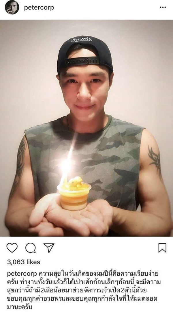 สำหรับคุณพ่อยิ้มสวย ปีเตอร์ คอร์ป ครบรอบ 43ปี เมื่อวันนี้ 1 มกราคม 2561 เป็นวันคล้ายวันเกิดของเจ้าตัว โดยในวันเกิดปีนี้หนุ่มปีเตอร์ ก็ได้ฉลองวันเกิดแบบเรียบง่ายกับคักเค้กก้อนเล็ก ๆ 1 ก้อน และเทียน 1 เล่ม ซึ่งเจ้าตัวบอกว่าเพียงเท่านี้ก็มีความสุขแล้ว  แต่จะมีความสุขยิ่งกว่า ถ้ามีเจ้า 2 เสือน้อย น้องแพนเตอร์น้องพูม่า มาช่วยกันจัดการเค้กก้อนนี้ด้วย ยังไง ก็ขอให้คุณพ่อปีเตอร์ มีความสุขมาก ๆ นะคะ