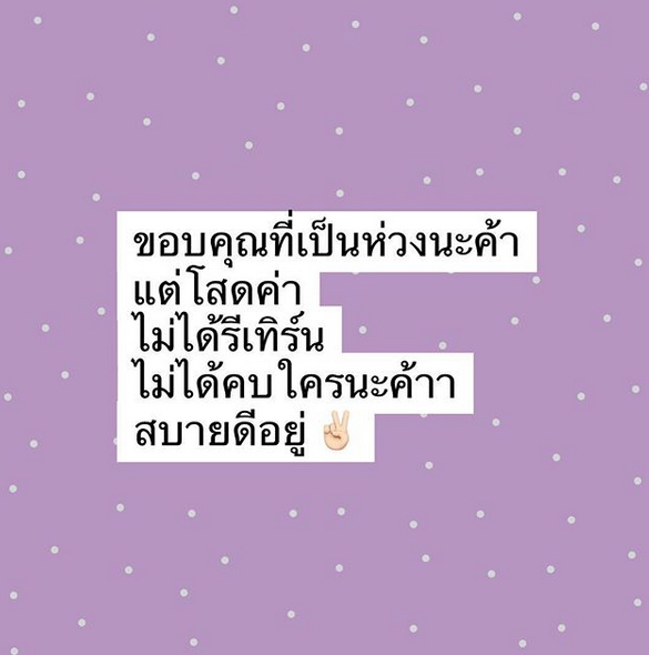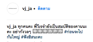 “ขอบคุณที่เป็นห่วงนะค้า แต่โสดค่า ไม่ได้รีเทิร์น ไม่ได้คบใครนะค้า สบายดีอยู่” พร้อมแคปชั่นใต้ภาพเก๋ๆ ว่า “ทุกคนคะ พี่วีเจจ๋ายังเป็นสมบัติของคานนะคะ อย่ากังวล #ก่อนจะไปกันใหญ่ #ฟังซิสนะ